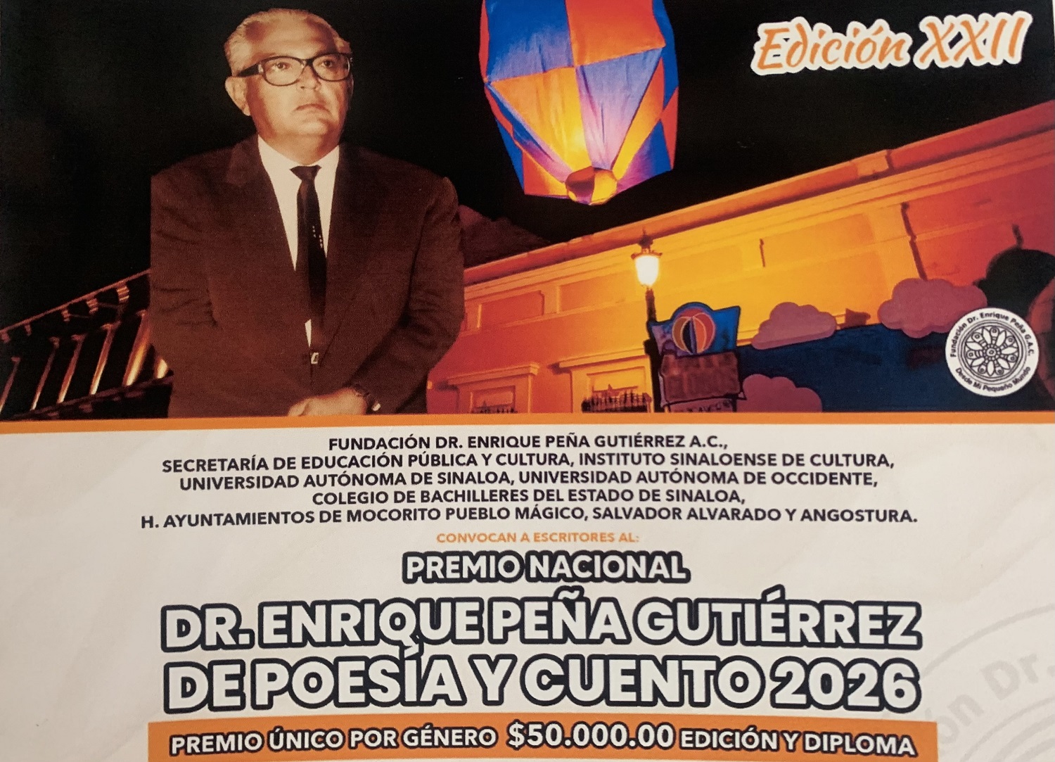 Culiacán.- La Fundación Dr. Enrique Peña Gutiérrez A.C. lanzó la convocatoria a escritores de todo el país a participar en la edición 22° del Premio Nacional Dr. Enrique Peña Gutiérrez de Poesía y Cuento, con un premio único por 50 mil pesos y diploma en cada género.