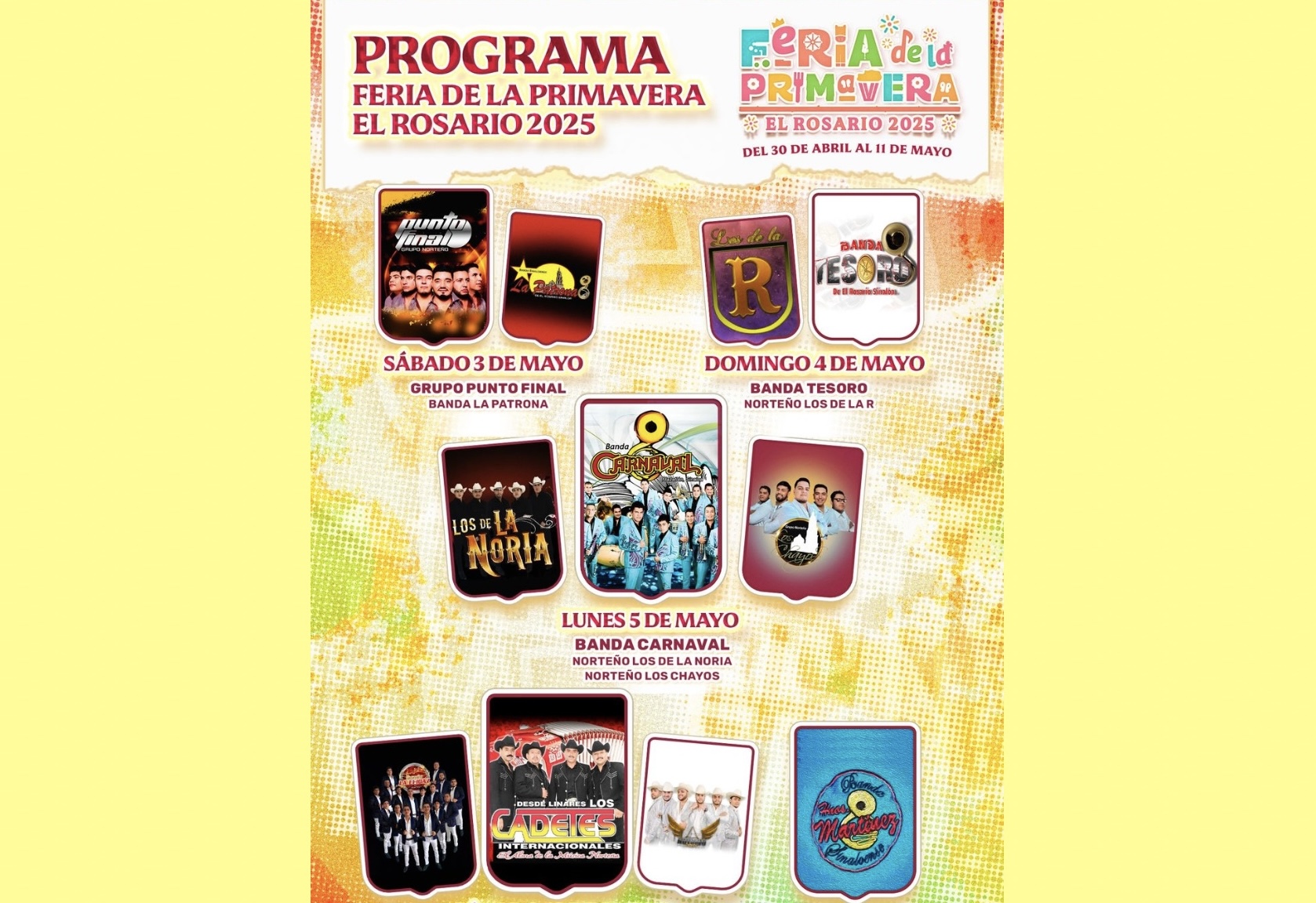 Los eventos musicales comenzarán el sábado 03 de mayo con la presentación de Punto Final y Banda La Patrona, para el domingo 04, Banda Tesoro y grupo norteño Los de la R, serán los encargados de poner a bailar a los rosarenses.