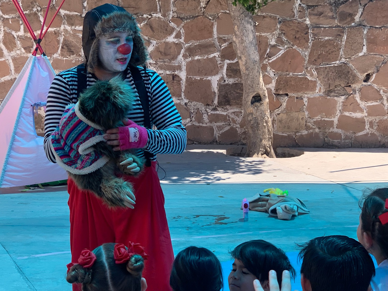 Como parte del espectáculo, el actor presentó a sus dos amigos títeres, “Dogui”, un oso perezoso y “Red”, con una canción de fondo que invitó a los niños a cantar y que decía “qué será de mí si me atrapa el frío invierno, que será de mí sin tu abrazo tibio y tierno”, destacando el valor de la amistad y de abrazar a quienes los rodean.