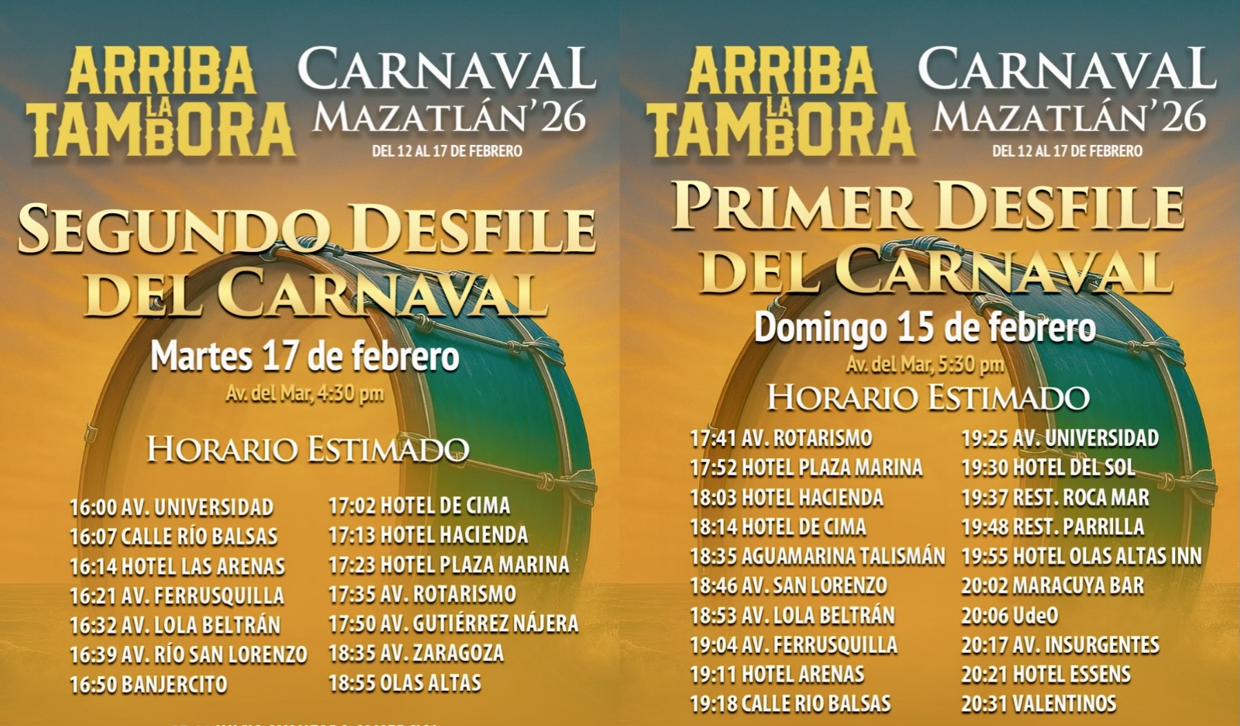 Mazatlán.- Mazatlán ya vibra, la tambora marca el pulso y el primer desfile del Carnaval Internacional Mazatlán 2026 “Arriba la Tambora” se llevará a cabo este domingo 15 de febrero como una celebración desbordante de música, tradición y figuras de gran renombre que saldrán al encuentro del público en el paseo costero.