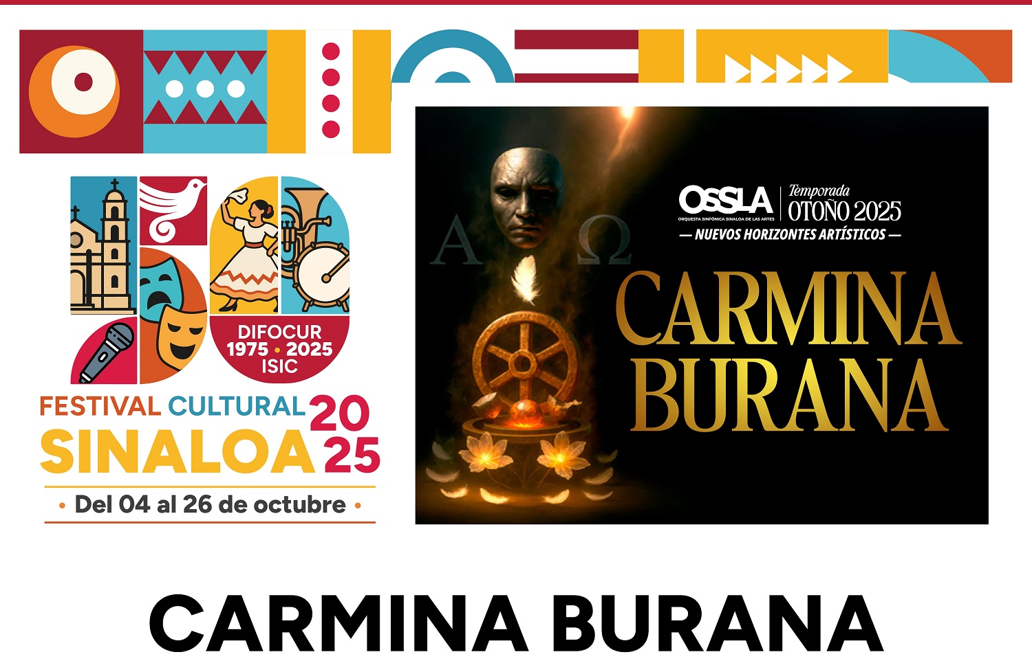 Culiacán.- Este sábado 4 de octubre abre el Festival Cultural Sinaloa 2025, el cual será inaugurado a las 16:00 horas en el patio del Museo de Arte de Sinaloa con la presentación del libro “DIFOCUR- ISIC, 50 años” y, a las 18:00 horas, la primera de dos escenas de la cantata escénica Carmina Burana, de Carl Orff, con la Orquesta Sinfónica Sinaloa de las Artes, solistas, coros y danza contemporánea.