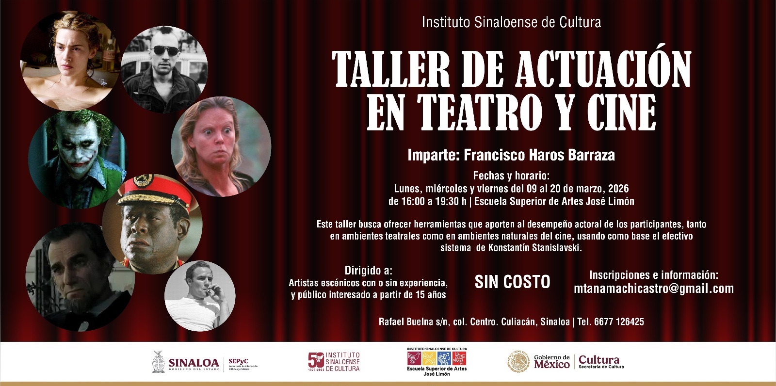 Culiacán.- El Instituto Sinaloense de Cultura, a través de la Dirección de Formación y Capacitación, impartirá de 09 al 20 de marzo en las instalaciones de la Escuela Superior de Artes José Limón, una nueva edición del Taller de Actuación en Teatro y Cine, a cargo del maestro Francisco Haros Barraza, con carácter gratuito.