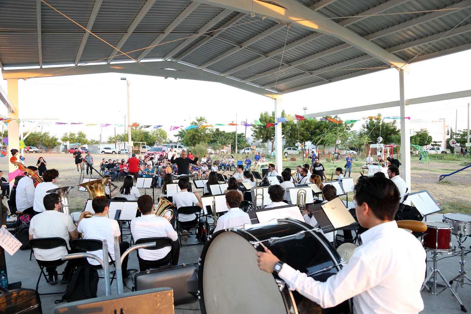 Culiacán.- El fraccionamiento Prados del Sol se unió al programa “El Arte Alegra tu Parque», que lleva a cabo el Instituto Sinaloense de Cultura (ISIC), en coordinación con el Patronato Parques Alegres, IAP, con la presentación de la Banda Sinfónica Juvenil del Estado que ofreció un variado concierto en el parque Prados del Sol del Desierto, dirigido por el maestro Diego Rojas.