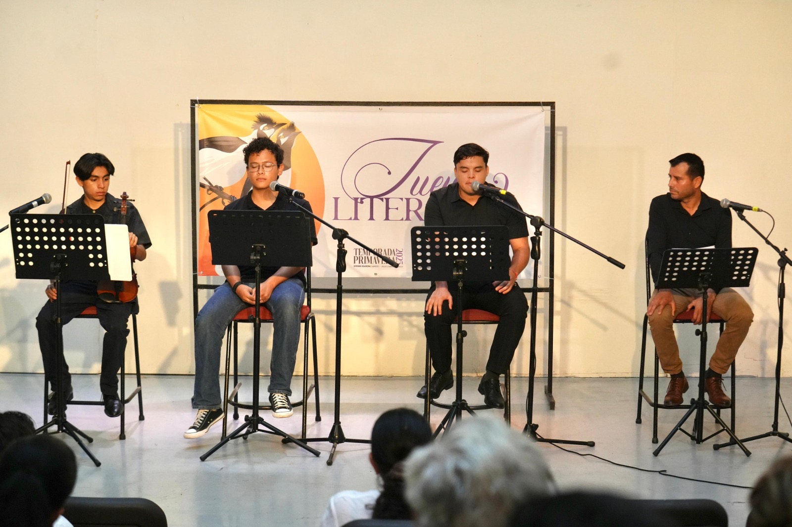 Decenas de asistentes en Casa Haas acompañaron a Hugo Haro, Isaías Camacho y Jesús Camarena, y al violinista Christian Domínguez, quien musicalizó esta exquisita tarde poética de la Temporada Primavera 2025.