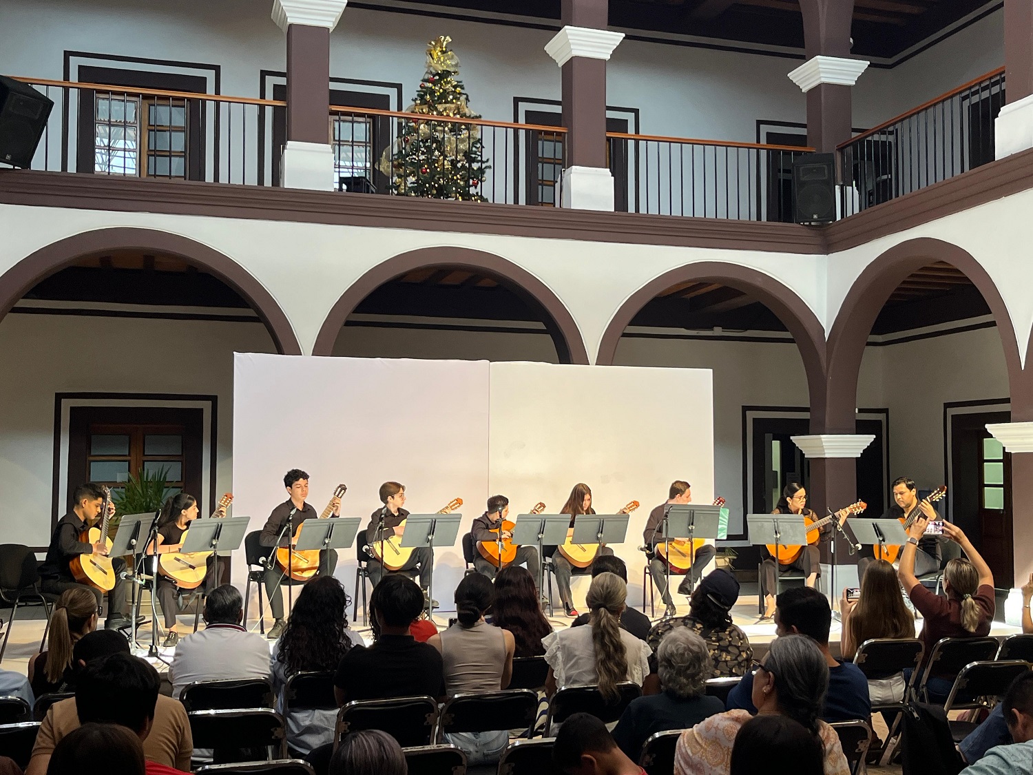 Finalmente, el segundo ensamble, compuesto por Dayanne Gaxiola, Valentina Arellanes, Daniella Torres, Alejandro Hernández, Santiago Camarillo, Antonio Lizárraga, Iker Madrid, Santiago Valenzuela y Zaid Pérez, ejecutó la tradicional inglesa “The First Noel”, “Carol Of The Bells” de Mikola Leontovich y la popular española “Malagueña”.