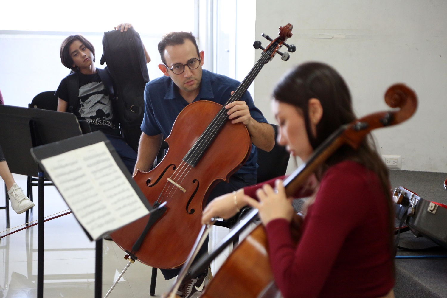 El reconocido director y cellista venezolano-mexicano, quien se encuentra en la ciudad para dirigir dos programas de la Temporada de Primavera de la Orquesta Sinfónica de las Artes, compartió su experiencia con los jóvenes estudiantes del instrumento, así como con los maestros de la ESUM.