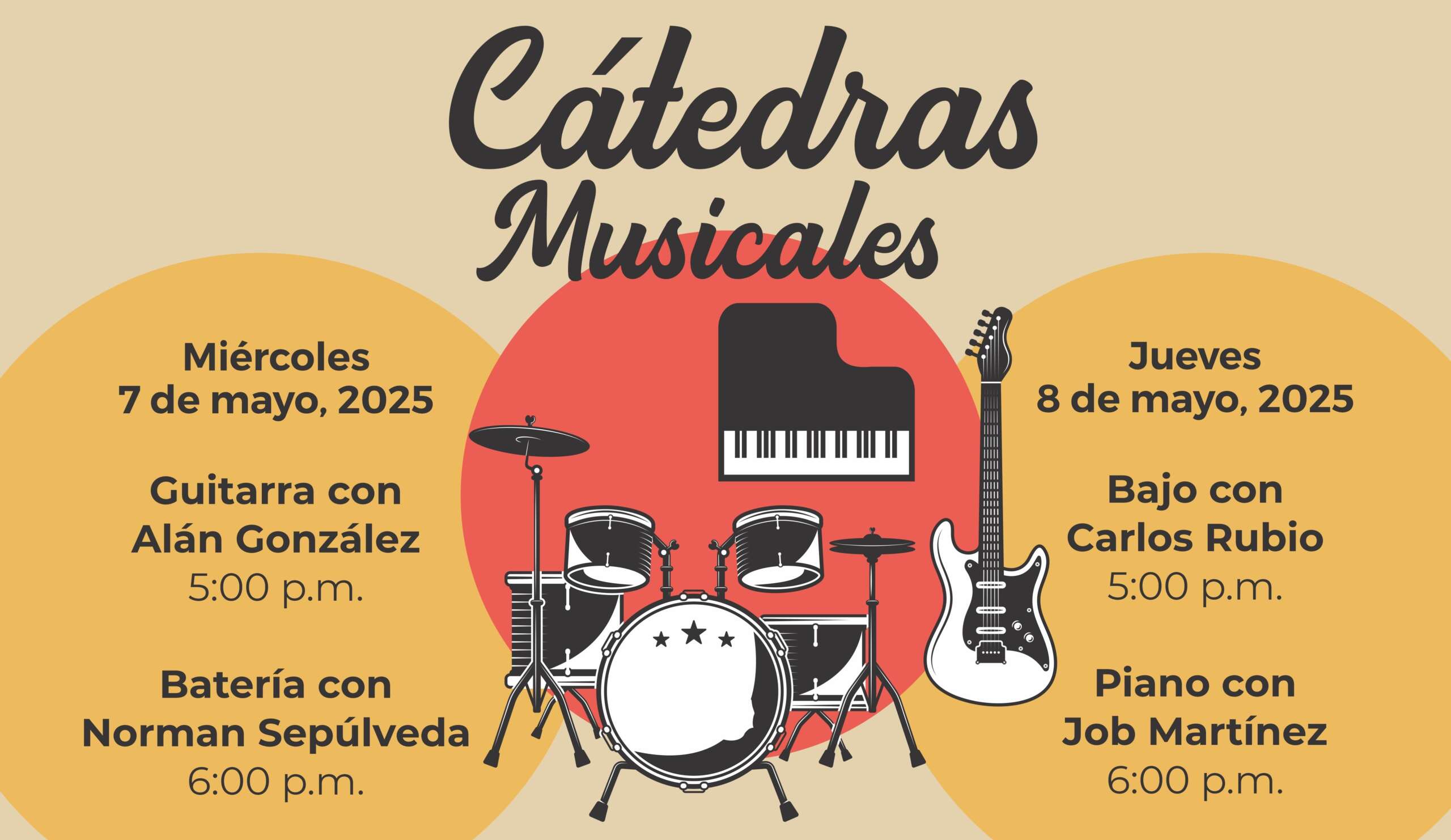 Las conferencias inician el miércoles 7 a las 17:00 horas con el jazzista Alan González, fundador del grupo Alan González 4tet, quien abordará el tema de la guitarra, y a las 18:00 horas de ese día, Norman Sepúlveda abordará el tema del instrumento de la batería.