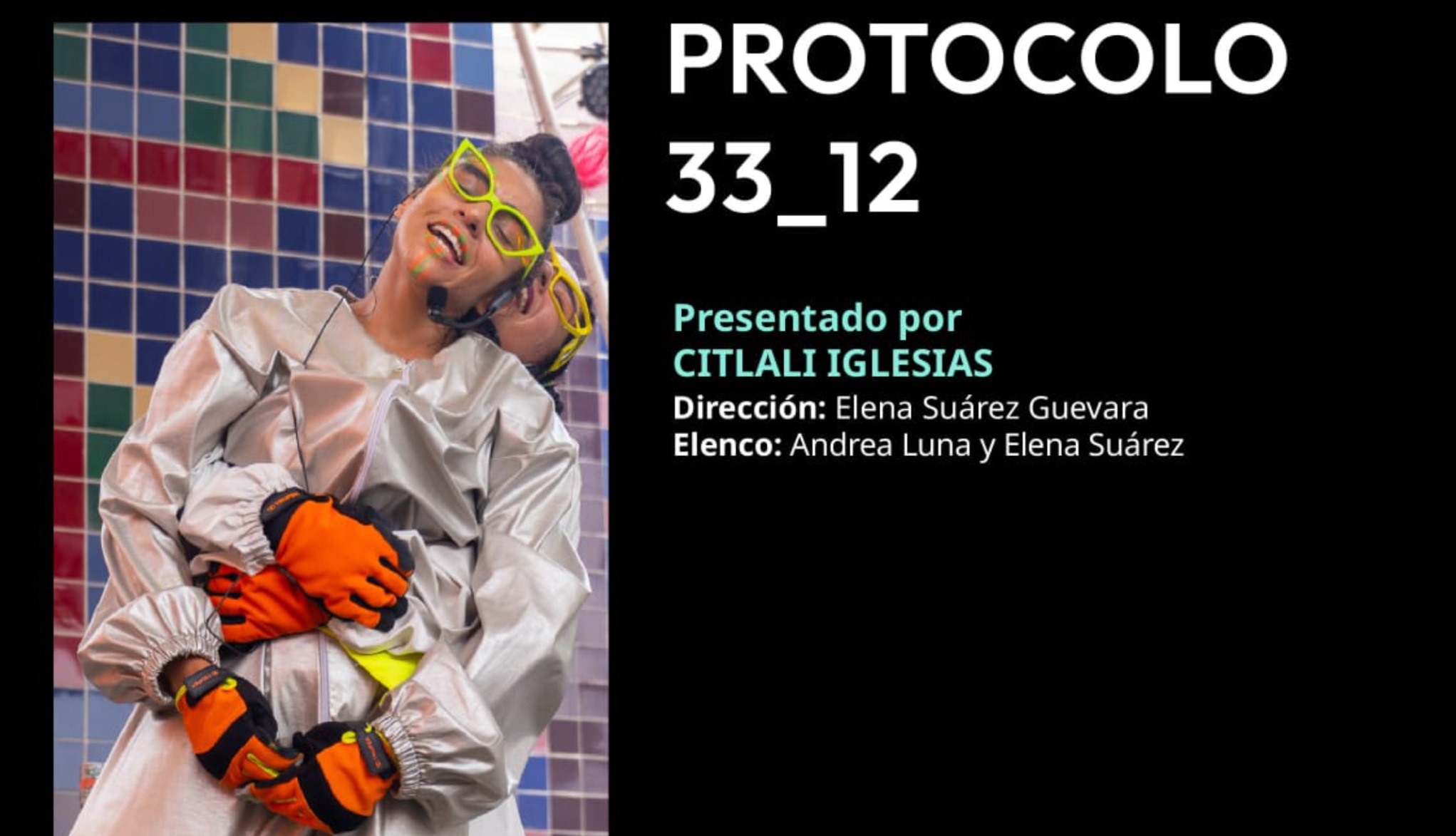 “Protocolo 33_12” es una puesta en escena contemporánea dirigida por Elena Suárez Guevara y producida por la compañía de Citlali Iglesias, bailarina, coreógrafa y docente con sede en Mazatlán, Sinaloa. El elenco está conformado por Andrea Luna y la propia directora.