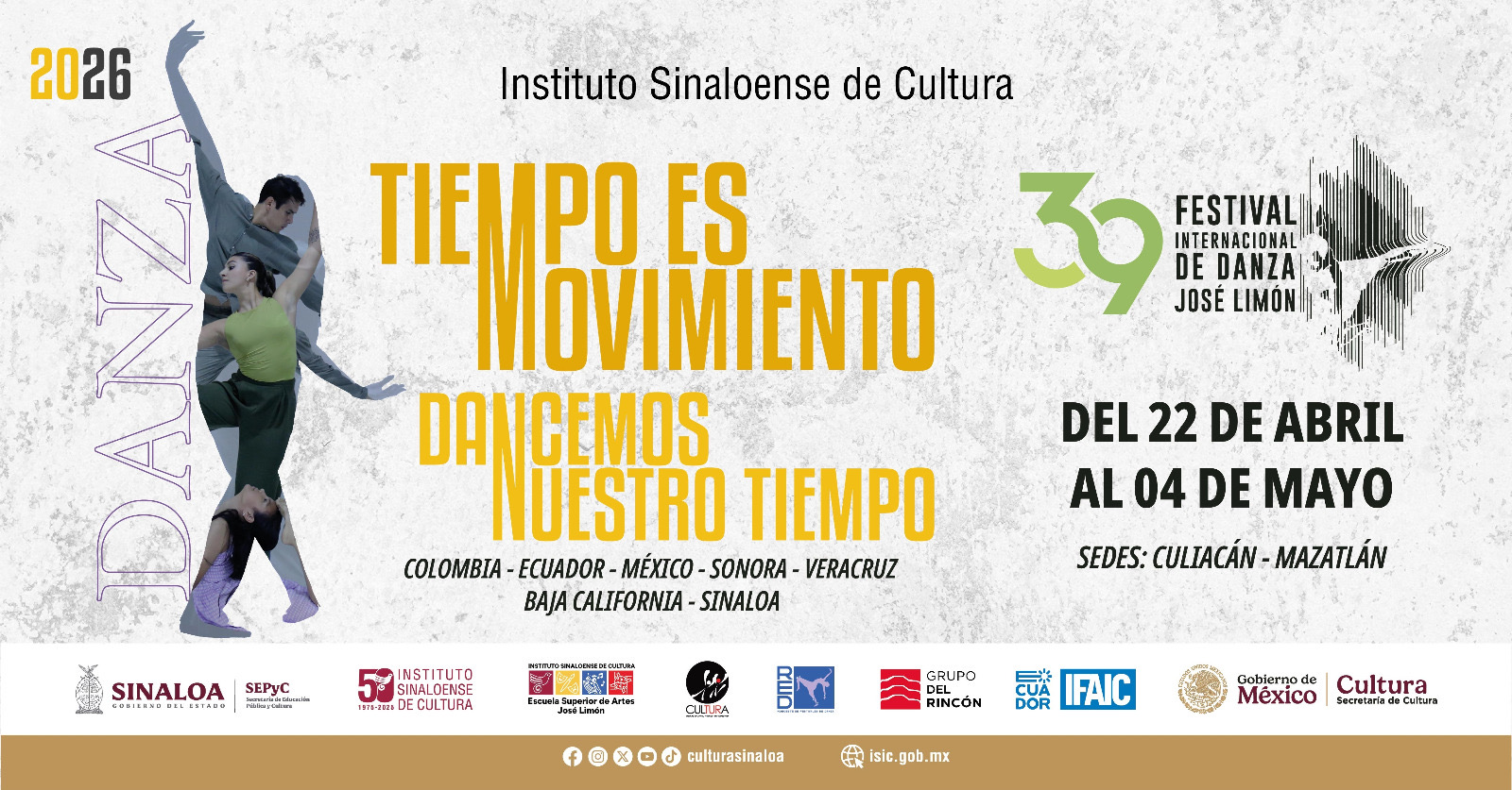 Culiacán.- Con una destacada programación que reúne talento local, nacional e internacional, el Instituto Sinaloense de Cultura (ISIC) invita a la comunidad a disfrutar del 39 Festival Internacional de Danza José Limón, que se llevará a cabo del 22 de abril al 4 de mayo en Culiacán y Mazatlán.