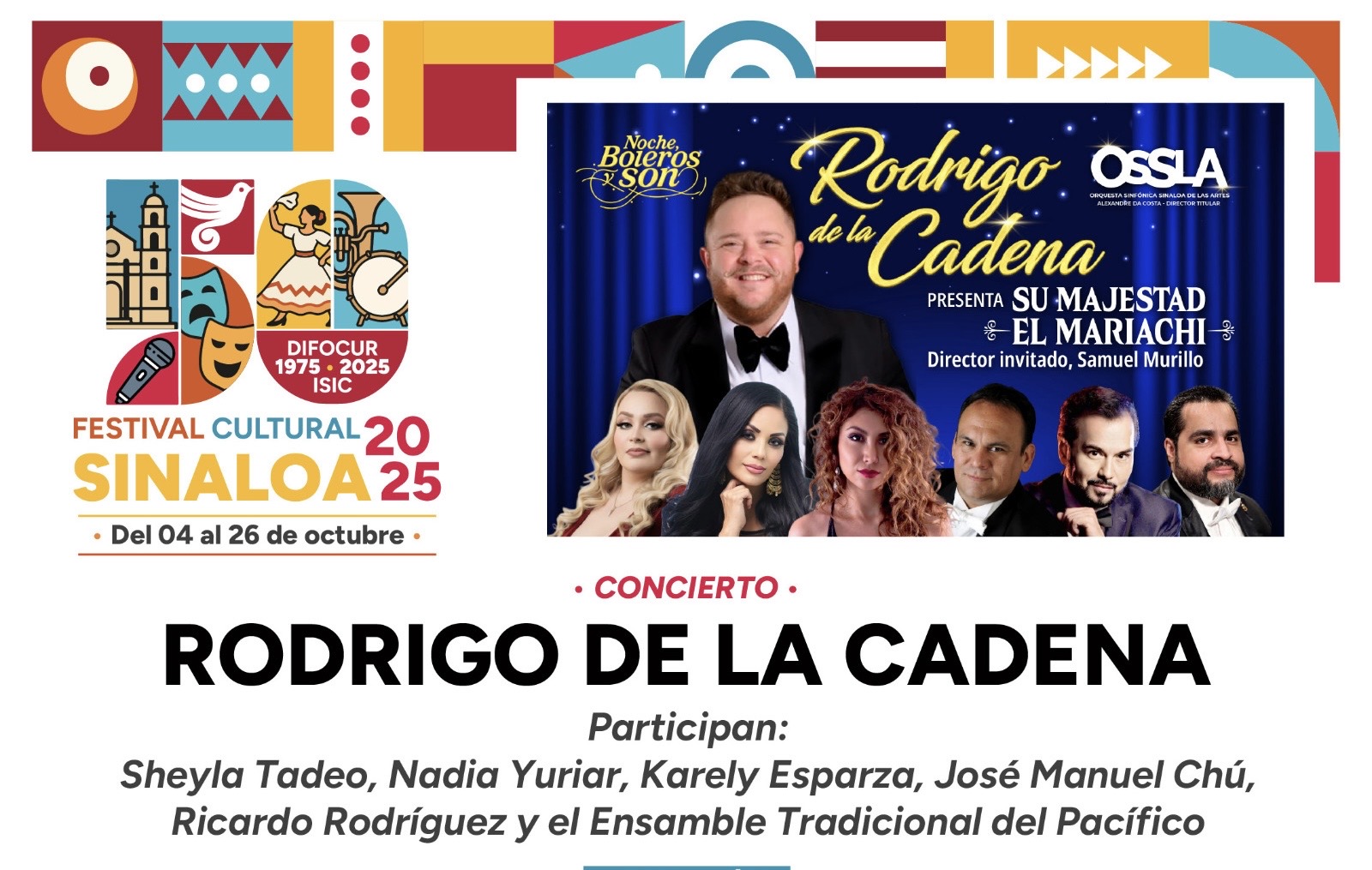 Culiacán.- Este miércoles, a las 18:00 horas en el Teatro Pablo de Villavicencio, continúa el programa del Festival Cultural Sinaloa 2025, con el espectáculo Su Majestad el Mariachi, con la Orquesta Sinfónica Sinaloa de las Artes, con el Mtro. Samuel Murillo como director huésped, y un grupo de solistas presidido por Rodrigo de la Cadena.